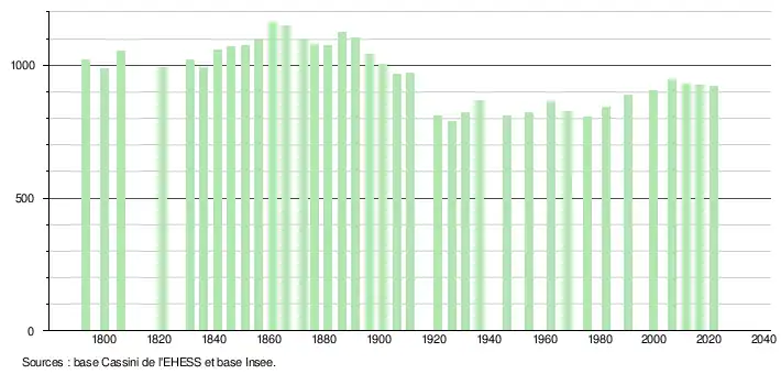 L'évolution du nombre d'habitants est connue à travers les recensements de la population effectués dans la commune depuis 1793. Pour les communes de moins de 10 000 habitants, une enquête de recensement portant sur toute la population est réalisée tous les cinq ans, les populations légales des années intermédiaires étant quant à elles estimées par interpolation ou extrapolation[26]. Pour la commune, le premier recensement exhaustif entrant dans le cadre du nouveau dispositif a été réalisé en 2006[27].