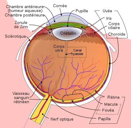 Il examine aussi la structure anatomique de l'œil. Selon Alhazen, l'œil est constitué de deux sphères. La plus grande est la sphère uvéale contenant le corps vitré, la plus petite est la sphère de la cornée. Les deux sphères s'intersectent selon une lentille bifocale qui donne le cristallin. Il place le nerf optique dans l'alignement des centres des deux sphères, au lieu de le déporter vers le nez[27]. Tous ces éléments sont inclus dans des membranes (non représentées dans le schéma ci-contre) destinées à maintenir la cohésion de l'ensemble. On retrouve dans cette conception anatomique quelques éléments figurant déjà chez Galien[28]. Quand il cherche à expliquer comment les rayons lumineux, en pénétrant dans l’œil, peuvent reconstituer l'image d'un objet, il se heurte à deux problèmes. Le premier est le diamètre de la pupille qui, trop important pour être considéré comme un trou d'aiguille, doit théoriquement reproduire une image floue. Ne voyant pas le cristallin comme une lentille capable d'effectuer une mise au point, il émet l'hypothèse que seuls les rayons traversant les surfaces de contact perpendiculairement sont conservés[29]. Ce qui le conduit à utiliser une réfraction pour qu'un même rayon soit perpendiculaire à la cornée et au cristallin. Le second problème rencontré est que ce fonctionnement conduit à avoir une image inversée dans l’œil. Cette inversion parait inconcevable à Alhazen qui redresse l'image par une nouvelle réfraction (solution élégante mais fausse)[30].