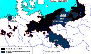 Les annexions de la Prusse sous Frédéric II : la Silésie en 1742, la Frise orientale en 1744, la Prusse royale avec le district de la Netze lors du premier partage de la Pologne en 1772, Mansfeld en 1780