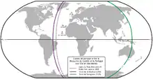 En 1493, il s'agit de régler le problème en ce qui concerne des territoires situés à plusieurs milliers de kilomètres à l'ouest de l'Afrique. Le traité de Tordesillas définit donc une ligne de partage selon un méridien situé à 370 lieues[3] (1 770 km) à l'ouest des îles du Cap-Vert (46° 37' Ouest dans le système actuel) : les territoires situés à l'ouest de ce méridien (en partant du Cap Vert), sont dévolus à la couronne de Castille (ils incluent les découvertes de Colomb) ; les territoires situés à l'est, à la couronne de Portugal (Afrique, mais aussi le Brésil, découvert en 1500 par le Portugais Pedro Alvares Cabral).