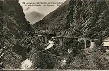 Après Nestalas, la ligne s'élève par un grand circuit à travers des prairies jusqu'au tunnel du Cap d'Estang. Ensuite, elle passe près de la mine de Peñarroya, qui possédait une halte pour ses ouvriers (mais le train n'assurait pas le transport du minerai). Elle suit un temps l'ancien tracé de la route, puis franchit le gave de Cauterets à la passerelle de Meyabat. Celle-ci est composée de quatre arches en pierre et de deux travées métalliques de 22,50 m qui reposent sur une pile centrale en maçonnerie de 16 m de haut, soit une longueur totale de 95 m.