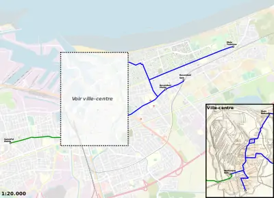- Entre la rue de l'Église et la limite communale vers Rosendaël (via la rue des Vieux quartiers, la rue du Magasin-à-Poudre, la rue de l'Abreuvoir, la Place du Théâtre (côté est - aujourd'hui place du Général-de-Gaulle), la rue Benjamin-Morel, la Place Calonne (partie nord), la rue de Nieuport, le pont de Rosendaël, la traversée des fortifications)[6], prolongée par la ligne suburbaine n°1.