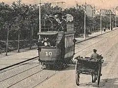 Lors de l'électrification par accumulateurs de 1899, après des essais infructueux de transformation du matériel hippomobile, la compagnie acquit quatorze motrices à impériales de conception anglaise, et utilisa alors le matériel hippomobile comme remorque des tramways électriques, après que l'impériale ait été supprimée[12].