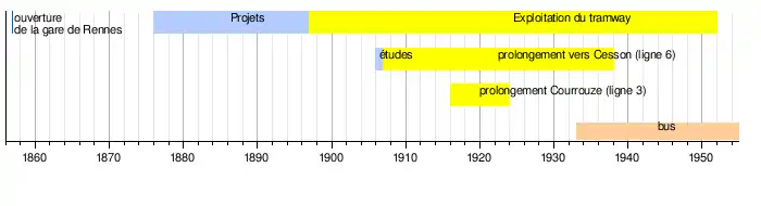 C'est à partir de 1876[1], dix-neuf ans après l’inauguration de la gare de Rennes des Chemins de Fer de l'Ouest les 26, 27 et , que le conseil municipal de Rennes entame des réflexions concrètes sur la mise en place d'un système de transports en commun, en examinant les projets qui seront présentés à l'administration. En effet, la gare est excentrée par rapport au centre-ville (au sud-est)[Note 1], et hormis les transports par calèche organisés pour les clients de la compagnie ferroviaire et les « voitures de place », il n'existe pas d'offre de transport en commun pour aller prendre le train.