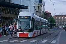CAF Urbos AXL à une station. CAF Urbos AXL à une station.