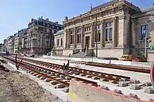 Le , c'est le Citadis 302 d'Alstom qui remporte l'appel d'offre de 22 rames[17]. Le marché a été chiffré a plus de 54 millions d'euros[18]. Malgré le classement au « Patrimoine de l'humanité » du centre reconstruit, la traversée de la place de l'hôtel de ville et de l'avenue Foch s'effectue par ligne aérienne de contact, contrairement à Nice (sections sur batteries), Bordeaux, Orléans, Reims, Angers et Tours (sections avec alimentation au sol).