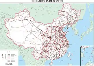 Le réseau ferroviaire classique est constitué de 16 artères principales, dont 8 verticales et 8 horizontales, composées de grandes lignes radiales centrées sur Pékin ainsi que des lignes transversales reliant l'ensemble du territoire national, ayant favorisé le désenclavement et le développement économique des territoires[3].