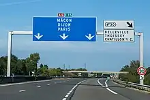 | Autoroute A6 | Autoroutes A6A et A6B à Wissous au sud de Paris | Belleville, Villefranche-sur-Saône | Route métropolitaine 6 à Dardilly au nord de Lyon | Autoroute entièrement concédée, payante et à 2x3 voies dans le département. |
