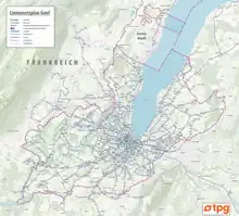 Le réseau des Transports publics genevois s'étend sur 426,490 km à travers le canton de Genève, quelques communes du canton de Vaud et les régions transfrontalières françaises voisines, incluant notamment Gex et Saint-Julien-en-Genevois[33]. En 2019, il a assuré 227,845 millions de voyages dont 767 000 voyages sur les lignes nocturnes[24].