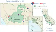 Depuis le redécoupage de 2020, le 33e district congressionnel de Californie est situé dans le sud de la Californie. Le district occupe une partie du sud-ouest du Comté de San Bernardino.