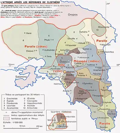Entre 508 et 507 av. J.-C.[4], l’homme politique Clisthène divise l'Attique en 139 dèmes, qui sont répartis en trente trittyes de trois ou quatre dèmes. Dix trittyes se situent dans ville d'Athènes et dans ses environs (la ville, astu), dix correspondent au territoire côtier (la côte, Paralia) et dix autres à des zones plus rurales (l’intérieur, Mésogée)[5]. Les dix nouvelles tribus, chacune ainsi pourvue de trois trittyes, ne correspondent plus à des ancêtres éponymes et ont toutes les mêmes droits, engagements, responsabilités et sacerdoces selon le droit du sol athénien commun, système qui met fin au clientélisme traditionnel, et s’impose dans l’organisation de toutes les institutions de la cité. On parle d'isonomie.