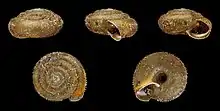 Coquille : elle mesure 3-6 x 5-11 avec 5 à 6 verticilles modérément convexes (arrondis ou très légèrement carénés à la périphérie).