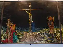 Le panneau central, représente la descente de croix, avec Notre Dame des Douleurs à ses pieds. À gauche, l'artiste a représenté l’archange Gabriel (patron des transmissions), à genoux, dans une attitude de révérence, et l’homme ancien, debout, enraciné en terre. À droite, l’archange Michel (patron de la France et des parachutistes), les ailes recouvertes d’écailles, le corps sombre, celui qui lutta contre le dragon, et, à ses pieds, l'homme nouveau sortant du tombeau.