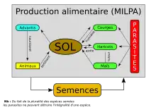 Chez les Iroquoiens, la technique de culture des trois sœurs permettait de mijoter la sagamité constituée des trois plantes représentant leur alimentation de base. Cela s'inscrit dans la permaculture avec le sol couvert en permanence par le feuillage de la courge, ainsi que le haricot qui fixe l'azote dans le sol grâce à des nodosités et le maïs qui sert de tuteur aux haricots. Cette technique, respectant la biodiversité, était une technique utilisée par les Iroquoiens puisque ces derniers se considéraient au service de la terre, protecteur de la biodiversité[2]. Ainsi, la permaculture n'a aucunement été influencée par l'agriculture comme cette dernière nécessite la fertilisation chimique ou non, le repos et la modification de la terre afin d'en récolter ses bienfaits.