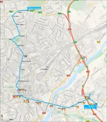 | Ouverture / Fermeture / — | Longueur 6 km | Durée 23 min | Nb. d’arrêts 17 | Matériel Cristalis ETB 12 Swisstrolley 4 Crealis IMC | Jours de fonctionnement L, Ma, Me, J, V, S | Jour / Soir / Nuit / Fêtes O / — / N / N | Voy. / an 1,6 million | Dépôt Clos Moreau | |