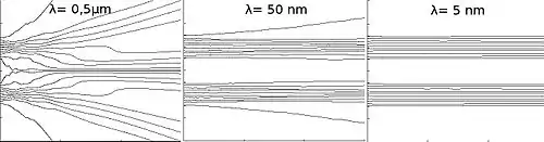 En complément de la théorie ondulatoire de Fresnel, il est possible de représenter le phénomène d'interférences des fentes de Young par des lignes de flux d'énergie (pour une onde monochromatique dans le vide).