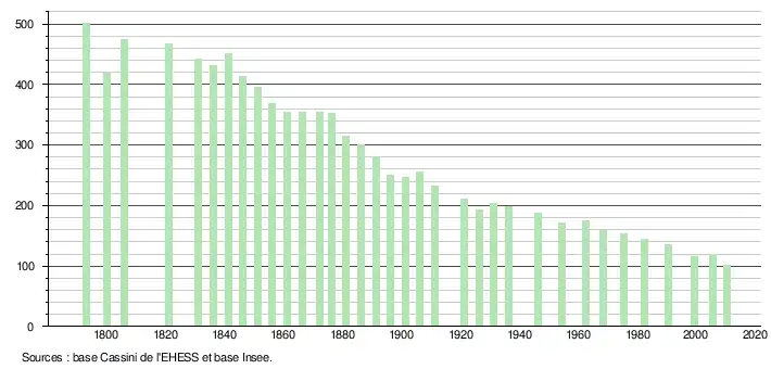 - Dans le tableau des recensements et le graphique, par convention dans Wikipédia, le principe a été retenu, pour les populations légales postérieures à 1999 de n’afficher dans le tableau des recensements et le graphique que les populations correspondant à l'année 2006, première population légale publiée calculée conformément aux concepts définis dans le décret no 2003-485 du 5 juin 2003, et les années correspondant à une enquête exhaustive de recensement pour les communes de moins de 10 000 habitants, ainsi que la dernière population légale publiée par l’Insee.