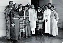Délégation tibétaine qui rencontra le premier ministre Nehru à New Delhi, le . Premier rang : Tsecha Thubten Gyalpo, Pema Yudon Shakabpa (épouse de Tsepon Shakabpa), Indira Gandhi, Jawaharlal Nehru, Tsering Dolma, Tsepon Wangchuk Deden Shakabpa, Depon Phuntsok Tashi Takla. Dernier rang : Jigmé Taring, moine inconnu (Geshe Lodo Gyatso?), et Chepon Chemo Driyul (beau-frère de Tsepon Shakabpa).