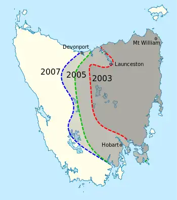 Cette histoire semble commencer avec un foyer d'épidémie détecté à l'est de la Tasmanie, qui depuis se propage régulièrement vers l'ouest (à partir de 2007 surtout)[60].