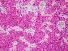 Les sarcomes d'Ewing, et plus généralement les tumeurs neuroectodermiques primitives (PNET), montrent une prolifération d'architecture diffuse, composée de petites cellules rondes au rapport nucléocytoplasmique élevé[5].