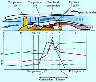 - Un compresseur (en) qui permet d'augmenter la pression et la température de l'air aspiré par le réacteur avant l'injection de carburant ;