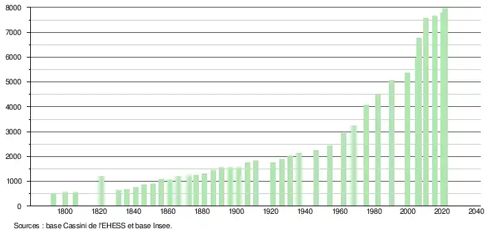 | L'évolution du nombre d'habitants est connue à travers les recensements de la population effectués dans la commune depuis 1793. Pour les communes de moins de 10 000 habitants, une enquête de recensement portant sur toute la population est réalisée tous les cinq ans, les populations légales des années intermédiaires étant quant à elles estimées par interpolation ou extrapolation[44]. Pour la commune, le premier recensement exhaustif entrant dans le cadre du nouveau dispositif a été réalisé en 2005[45]. En 2021, la commune comptait 7 956 habitants[Note 4], en augmentation de 3,85 % par rapport à 2015 (Landes : +4,9 %, France hors Mayotte : +1,84 %). |