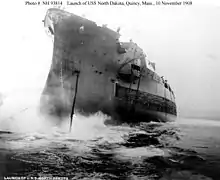 La quille du North Dakota est posée le au chantier naval Fore River de Quincy dans le Massachusetts. Le navire est lancé le , et mis en service dans l'US Navy le [1]. Le , le navire doit faire face à l'explosion d'un réservoir d'huile et à un feu en mer. Six hommes - les Chief Petty Officer (en) watertender (en) August Holtz (en) et Patrick Reid (en), les chefs machinist's Mate (en) Thomas Stanton (en) et Karl Westa (en), le machinist's Mate Charles Church Roberts (en), et le watertender Harry Lipscomb (en) - reçoivent chacun la Médaille d'honneur pour leur héroïsme extraordinaire lors de l'incendie[4].