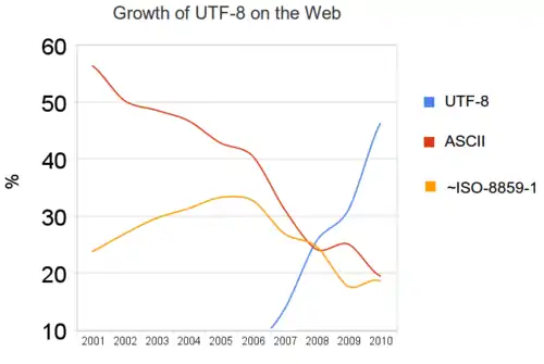 | Graphe indiquant l'utilisation d'UTF-8 (bleu clair) dépassant les principaux autres codages de caractères de texte sur le Web. Vers 2010 la prévalence d'UTF-8 était de l'ordre de 50%, mais en 2016, elle était plutôt de 90%. |