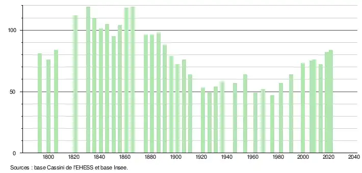 | L'évolution du nombre d'habitants est connue à travers les recensements de la population effectués dans la commune depuis 1793. Pour les communes de moins de 10 000 habitants, une enquête de recensement portant sur toute la population est réalisée tous les cinq ans, les populations légales des années intermédiaires étant quant à elles estimées par interpolation ou extrapolation[32]. Pour la commune, le premier recensement exhaustif entrant dans le cadre du nouveau dispositif a été réalisé en 2008[33]. En 2021, la commune comptait 84 habitants[Note 7], en augmentation de 13,51 % par rapport à 2015 (Hautes-Pyrénées : +1,04 %, France hors Mayotte : +1,84 %). |