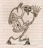 « Une créature bizarre, aux formes indéfinies - petite, grise, terriblement remuante - accourut d'on ne sait d'où. Ricanant sans arrêt, elle s'agitait, tremblait et tournait autour de lui. Mais lorsqu'il lui tendait la main, elle s'éclipsait aussitôt, s'échappait par la porte ou se réfugiait sous l'armoire, pour réapparaître une minute plus tard, ricanant, tremblant, persiflant et toujours aussi grise, fureteuse et inexpressive… Peredonov comprit de quoi il s'agissait et s'empressa de prononcer quelques formules d'exorcisme à voix basse. L'étrange créature émit un sifflement faible, très faible, se roula en toute petite boule et, en roulant, s'échappa de la pièce. »[5]