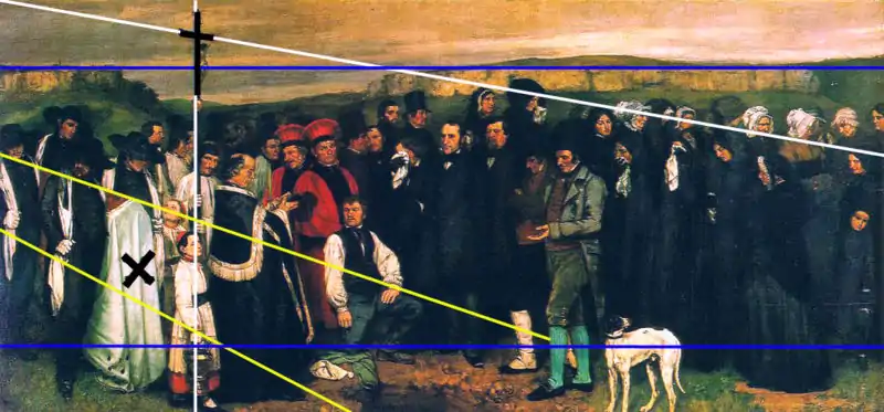 - Tout d'abord, si l'on suit les lignes formées par les falaises en arrière-plan et les pieds de la foule au premier plan (en bleu), on voit que le ciel, et même les « cieux », empreints de spiritualité grâce au Christ (près duquel demeure l'esprit du mort selon la religion chrétienne), s'opposent à la terre et à la fosse où le corps physique va être enterré.