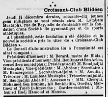 Les jeunes Arabes de la ville n'avaient pas le droit de pratiquer le sport. Chose qui leur était interdite par les autorités locales ; ils ne pouvaient donc pas prétendre adhérer à cette société, car considérés par ces derniers, comme des paysans endurcis, et par conséquent, inaptes à toute activité créative. Les années 1910, des jeunes Blidéens ardents décident de créer un club musulman de Blida, après plusieurs démarches au début des années 1910 (Le Croissant Club Blidéen fondé en décembre 1911 sous la présidence de Boudjakdji Mustapha[1] puis Le Sporting Club Blidéen en janvier 1921 présidé par Hassen Benabdellah[2],[3]). Des contacts sont amorcés auprès de la ligue française de football et de la préfecture pour la délivrance d'agrément. Elle accueillait les sportifs arabes de la ville ainsi que ceux de la Mitidja, les initiant au militantisme pour leur permettre de participer à la lutte que menait le peuple algérien pour se libérer du joug colonial, créer un cadre authentique de patriotisme à la jeunesse musulmane et gagner contre une équipe française permettant l'affirmation de la personnalité algérienne.