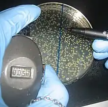 Au lieu d'unités formant colonie, les paramètres Nombre le plus probable (NPP)[25] et Unités de Fishman modifiées (MFU)[26] peuvent être utilisés. La méthode du nombre le plus probable compte les cellules viables et est utile lors de l'énumération de faibles concentrations de cellules ou de l'énumération des microbes dans les produits où les particules rendent le comptage sur plaque peu pratique[27]. Les unités Fishman modifiées tiennent compte des bactéries viables mais non cultivables[28].