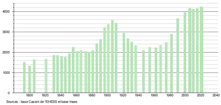 L'évolution du nombre d'habitants est connue à travers les recensements de la population effectués dans la commune depuis 1793. Pour les communes de moins de 10 000 habitants, une enquête de recensement portant sur toute la population est réalisée tous les cinq ans, les populations légales des années intermédiaires étant quant à elles estimées par interpolation ou extrapolation[19]. Pour la commune, le premier recensement exhaustif entrant dans le cadre du nouveau dispositif a été réalisé en 2005[20].