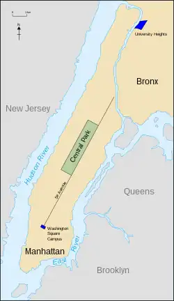 La plupart des bâtiments de l'université de New York sont situés à l'intérieur d'une zone bordée au sud par Houston Street, à l'est par Broadway, au nord par la 14e Rue et à l'ouest par la Sixième Avenue[73].