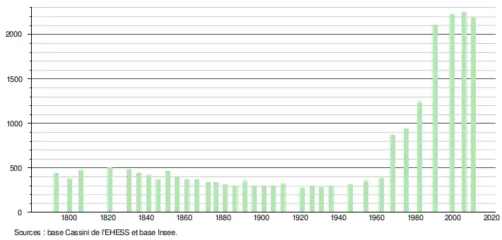 L'évolution du nombre d'habitants est connue à travers les recensements de la population effectués dans la commune depuis 1793. À partir du , les populations légales des communes sont publiées annuellement dans le cadre d'un recensement qui repose désormais sur une collecte d'information annuelle, concernant successivement tous les territoires communaux au cours d'une période de cinq ans. Pour les communes de moins de 10 000 habitants, une enquête de recensement portant sur toute la population est réalisée tous les cinq ans, les populations légales des années intermédiaires étant quant à elles estimées par interpolation ou extrapolation[21]. Pour la commune, le premier recensement exhaustif entrant dans le cadre du nouveau dispositif a été réalisé en 2005[22],[Note 2].