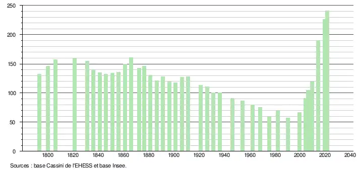 L'évolution du nombre d'habitants est connue à travers les recensements de la population effectués dans la commune depuis 1793. Pour les communes de moins de 10 000 habitants, une enquête de recensement portant sur toute la population est réalisée tous les cinq ans, les populations légales des années intermédiaires étant quant à elles estimées par interpolation ou extrapolation[22]. Pour la commune, le premier recensement exhaustif entrant dans le cadre du nouveau dispositif a été réalisé en 2004[23].