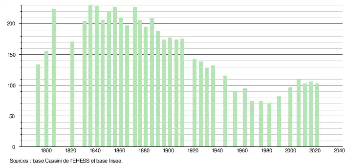 | L'évolution du nombre d'habitants est connue à travers les recensements de la population effectués dans la commune depuis 1793. Pour les communes de moins de 10 000 habitants, une enquête de recensement portant sur toute la population est réalisée tous les cinq ans, les populations légales des années intermédiaires étant quant à elles estimées par interpolation ou extrapolation[29]. Pour la commune, le premier recensement exhaustif entrant dans le cadre du nouveau dispositif a été réalisé en 2006[30]. En 2021, la commune comptait 103 habitants[Note 6], en diminution de 1,9 % par rapport à 2015 (Hautes-Pyrénées : +1,04 %, France hors Mayotte : +1,84 %). |