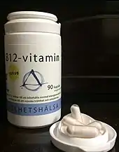 La vitamine B12, ou cobalamine, n'est synthétisée que par certaines bactéries et archées. Elle peut toutefois se retrouver en quantité suffisante dans les tissus des animaux et en quantité infime dans les tissus des végétaux ou autres formes de vie incapables de la produire, soit par interaction microbienne soit par consommation directe de B12[65],[66],[67]. Beaucoup de céréales du petit déjeuner sont enrichies en vitamine B12[68]. Des algues, comme la spiruline, contiennent principalement des analogues de vitamine B12 qui ne sont pas utilisables par les humains ; d'autres algues pourraient en fournir une forme biodisponible, du moins chez le rat[69] (la vitamine B12 est d'ailleurs un élément nécessaire à la croissance de certaines algues[70]), mais, selon le consensus actuel, les algues ne seraient pas une source fiable de vitamine B12[71]. Quant à la levure de bière, pourtant riche en vitamines B, elle n'en contient pas non plus[72]. Chez l'humain, la vitamine B12 est synthétisée dans le côlon où elle ne peut pas être absorbée[73].