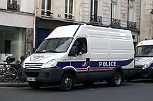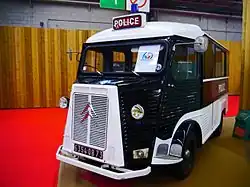 Drapeau de la France Citroën Type H Premier fourgon cellulaire ou car Police Secours. Les premiers véhicules sont équipés de grillages à l'intérieur du car, mais après mai 68 ils sont posés à l'extérieur du véhicule pour protéger les équipages des éclats de verre, lui valant le surnom de « panier à salade ». Le modèle est équipé par la marque Chausson[9]. 1960 - 1983