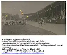 En se basant sur l’examen de ces photos publiées dans Le Monde illustré, on peut en déduire que l’emplacement final correspond à celui décrit dans La Patrie du 16 février 1898[7]. Cet article apparaît trois mois avant la fin de la construction du vélodrome Queen’s Park (17 mai 1898). Citation[7] :