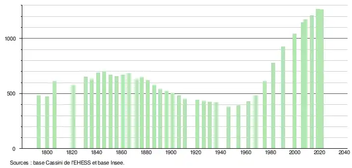 L'évolution du nombre d'habitants est connue à travers les recensements de la population effectués dans la commune depuis 1793. Pour les communes de moins de 10 000 habitants, une enquête de recensement portant sur toute la population est réalisée tous les cinq ans, les populations légales des années intermédiaires étant quant à elles estimées par interpolation ou extrapolation[26]. Pour la commune, le premier recensement exhaustif entrant dans le cadre du nouveau dispositif a été réalisé en 2008[27].