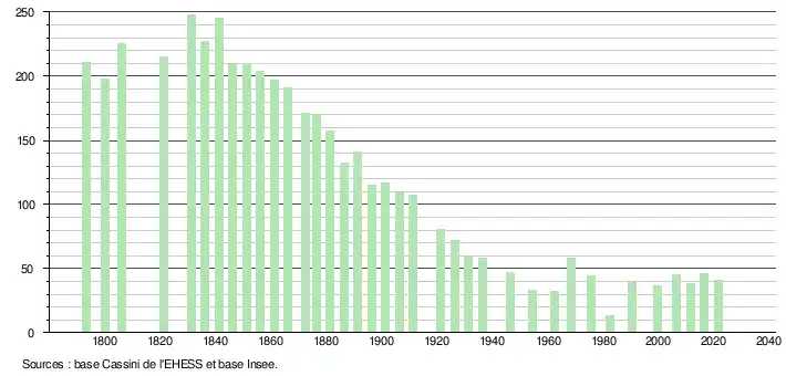 L'évolution du nombre d'habitants est connue à travers les recensements de la population effectués dans la commune depuis 1793. Pour les communes de moins de 10 000 habitants, une enquête de recensement portant sur toute la population est réalisée tous les cinq ans, les populations légales des années intermédiaires étant quant à elles estimées par interpolation ou extrapolation[23]. Pour la commune, le premier recensement exhaustif entrant dans le cadre du nouveau dispositif a été réalisé en 2006[24].