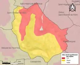 La commune est vulnérable au risque de mouvements de terrains constitué principalement du retrait-gonflement des sols argileux[16]. Cet aléa est susceptible d'engendrer des dommages importants aux bâtiments en cas d’alternance de périodes de sécheresse et de pluie. 99,4 % de la superficie communale est en aléa moyen ou fort (67,5 % au niveau départemental et 48,5 % au niveau national). Sur les 790 bâtiments dénombrés sur la commune en 2019, 768 sont en aléa moyen ou fort, soit 97 %, à comparer aux 90 % au niveau départemental et 54 % au niveau national. Une cartographie de l'exposition du territoire national au retrait gonflement des sols argileux est disponible sur le site du BRGM[17],[Carte 2].