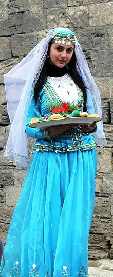 Le costume féminin national des Azerbaïdjanaises est composé de vêtements et de sous-vêtements. Il comprend un châle en forme de tchadra et un voile - rubend, qui était porté par les femmes en plein air. Les vêtements étaient cousus de textiles vifs et colorés, dont la qualité dépendait des revenus de la famille. Les vêtements comprenaient également une variété de bijoux différents. Contrairement aux aînés, les jeunes femmes portaient des vêtements plus brillants avec des fleurs brillantes.