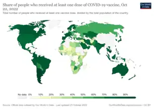 Au , 10,6 des milliards de doses de vaccin anti-covid ont été administrées dans le monde sur la base des rapports officiels des agences nationales de santé rassemblés par Our World in Data. L'OMS et la CEPI planifient actuellement le déploiement mondial de plusieurs vaccins anti-covid dans les pays en développement à forte densité de population[57],[58].