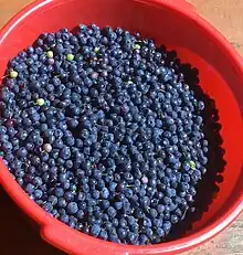 Les baies globuleuses, bleu noir, ressemblent beaucoup aux myrtilles (Vaccinium myrtillus) mais la pulpe intérieure est blanche et non rouge. Appelée également « myrtille aux loups », ce qui indique une qualité nutritive moindre que la myrtille commune.