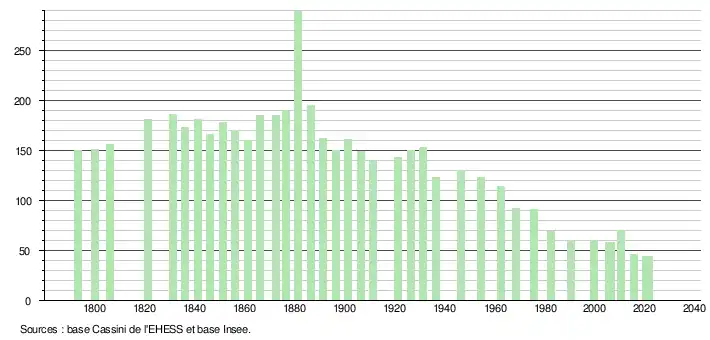 L'évolution du nombre d'habitants est connue à travers les recensements de la population effectués dans la commune depuis 1793. Pour les communes de moins de 10 000 habitants, une enquête de recensement portant sur toute la population est réalisée tous les cinq ans, les populations légales des années intermédiaires étant quant à elles estimées par interpolation ou extrapolation[14]. Pour la commune, le premier recensement exhaustif entrant dans le cadre du nouveau dispositif a été réalisé en 2005[15].