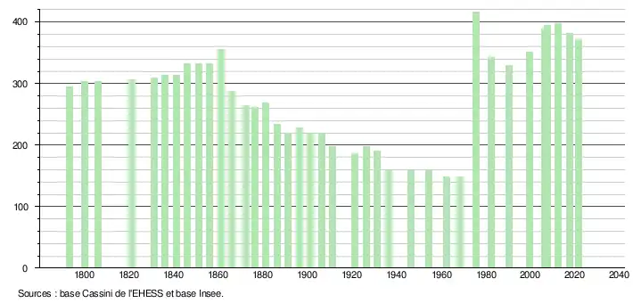 L'évolution du nombre d'habitants est connue à travers les recensements de la population effectués dans la commune depuis 1793. Pour les communes de moins de 10 000 habitants, une enquête de recensement portant sur toute la population est réalisée tous les cinq ans, les populations légales des années intermédiaires étant quant à elles estimées par interpolation ou extrapolation[15]. Pour la commune, le premier recensement exhaustif entrant dans le cadre du nouveau dispositif a été réalisé en 2007[16].
