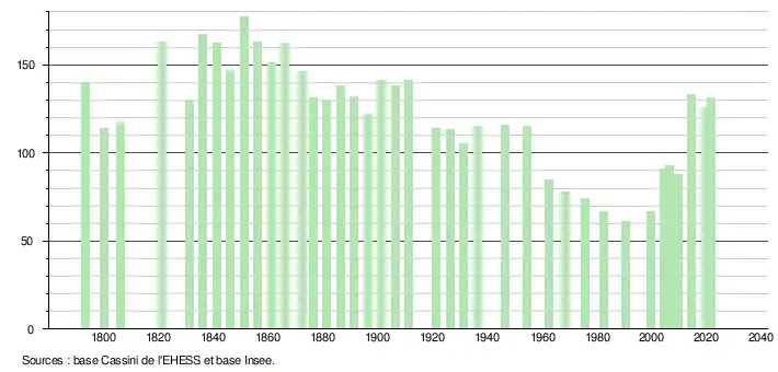 L'évolution du nombre d'habitants est connue à travers les recensements de la population effectués dans la commune depuis 1793. Pour les communes de moins de 10 000 habitants, une enquête de recensement portant sur toute la population est réalisée tous les cinq ans, les populations légales des années intermédiaires étant quant à elles estimées par interpolation ou extrapolation[16]. Pour la commune, le premier recensement exhaustif entrant dans le cadre du nouveau dispositif a été réalisé en 2004[17].